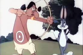 Hiding in the quiver, Bugs keeps calling out his supposed whereabouts, and getting the man to waste his arrows. Have a heart! Those things are expensive! Bugs bends one to make it return to sender, and after the man gets appointed, Bugs says he’s right over there. Bugs himself becomes the next arrow fired, and manages to give a kiss before he’s released. He laughs at his good fortune, but flies right into a tree. Advantage: the man. Bugs finds himself tied to a stake, whilst the man starts cooking some vegetables. Bugs is gonna be force fed and like it!