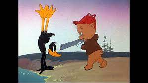 Out of bullets in his rifle, Porky pulls out a pistol and prepares to kill Daffy. Daffy begs to say goodbye to his family. Porky feels he can’t shoot a married duck with children and leaves. As soon as he’s gone the other ducks reveal themselves to be friends of Daffy’s. They all laugh…until Porky comes back for revenge.