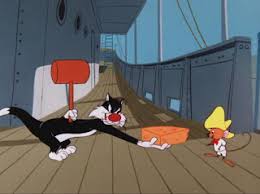 At the Mexican docks, all the mice are having a hard time surviving. There’s no cheese and they are starving. (Gee, that’s a shame. Considering, that mice can eat just about everything that is edible.) It’s gotten so bad, that they are even dreaming about the stuff. But wait! It’s not a dream! An honest to goodness, boat full of cheese is docking. The run up happily and run back down scared. There’s a one Sylvester the cat on board guarding it all. It’s hopeless. One mouse prepares to do himself in. (It works as a joke, because of his companion’s blatant lack of respect for him.)