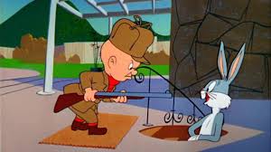 Bugs sticks to his guns by plugging Elmer’s with his carrot. Going back down, he finds what Daffy has been up to. With Elmer right outside the door, Bugs attempts to kill one bird with one stone by suggesting Daffy perform in front of the zoom-r lens. Being Fudd’s rifle, Daffy gets his beak bent for the umpteenth time. Unamused, Daffy claims that Bugs isn’t special. Anyone could do his shtick if they have a rabbit outfit and a carrot. He demonstrates, and Elmer mistakes him for the real thing.