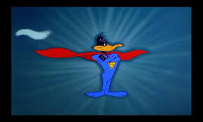The voice claims he is Aardvark Ratnik and that he will blow up everything he darn well pleases. Not if Stupor Duck has any say in it! Daffy leaves to go get in his costume. (Shame. I was enjoying those glasses) While he’s away, he misses the part where the editor turns off the TV, wondering why he bothers watching such soap operas. I never question watching all the cartoons I do. Enjoy your pleasures! Stupor Duck comes in and assumes that Ratnik escaped though the window. He “follows” and smacks into a skyscraper.